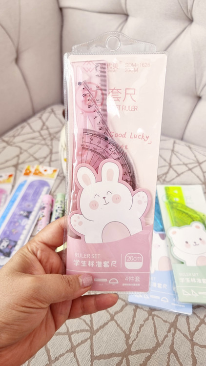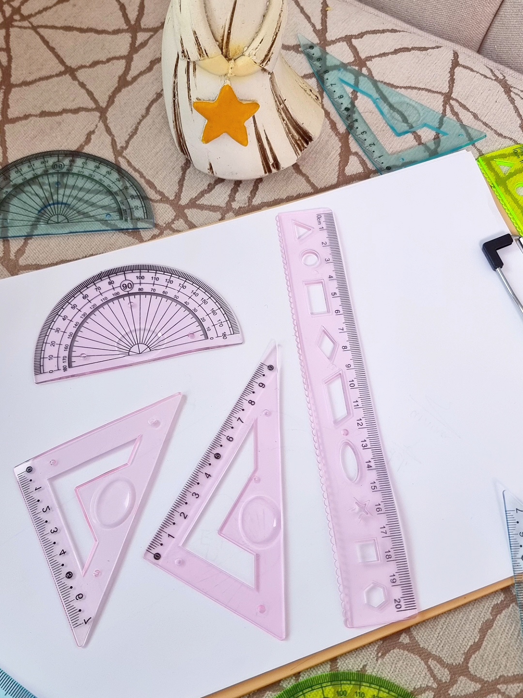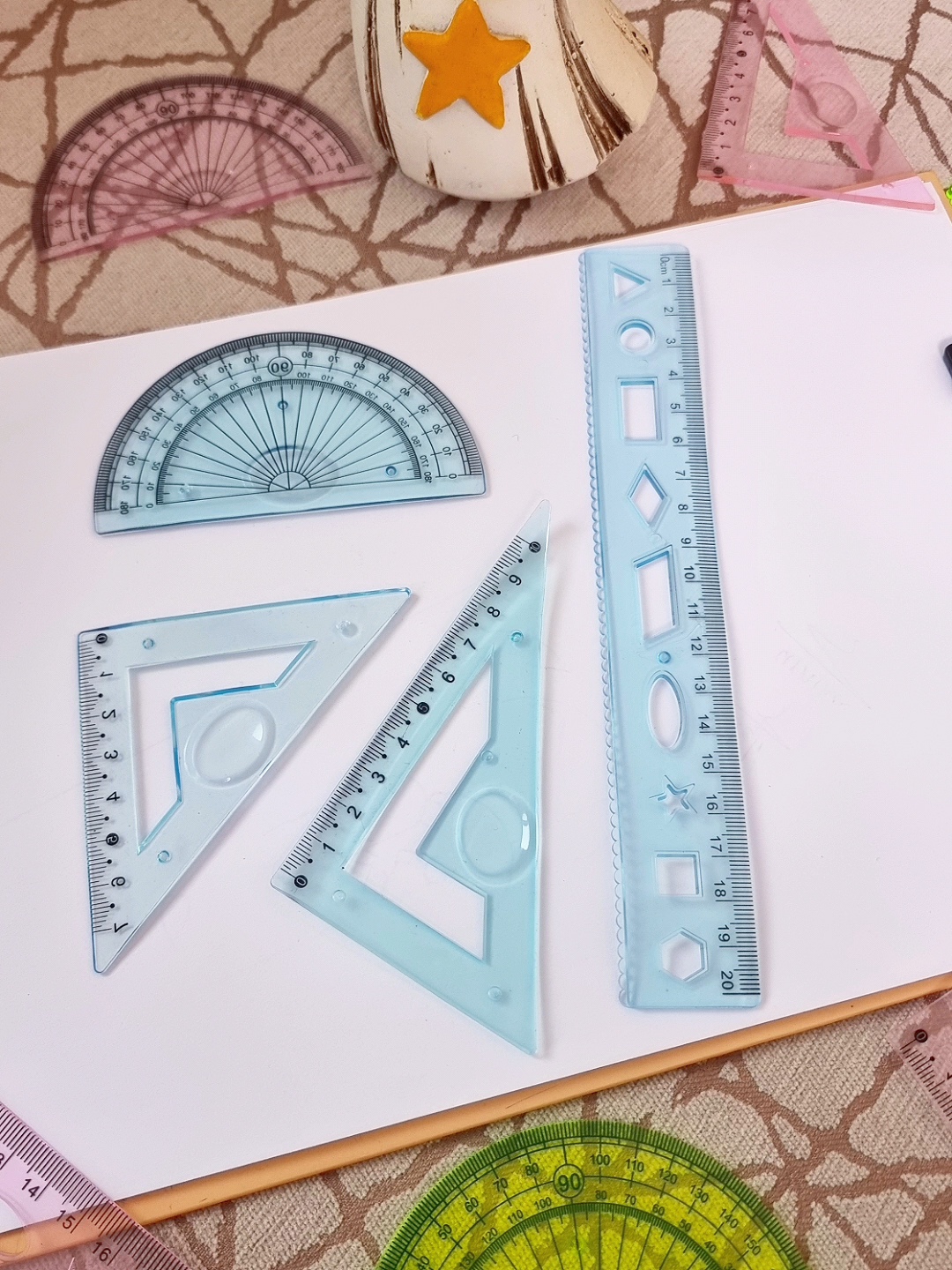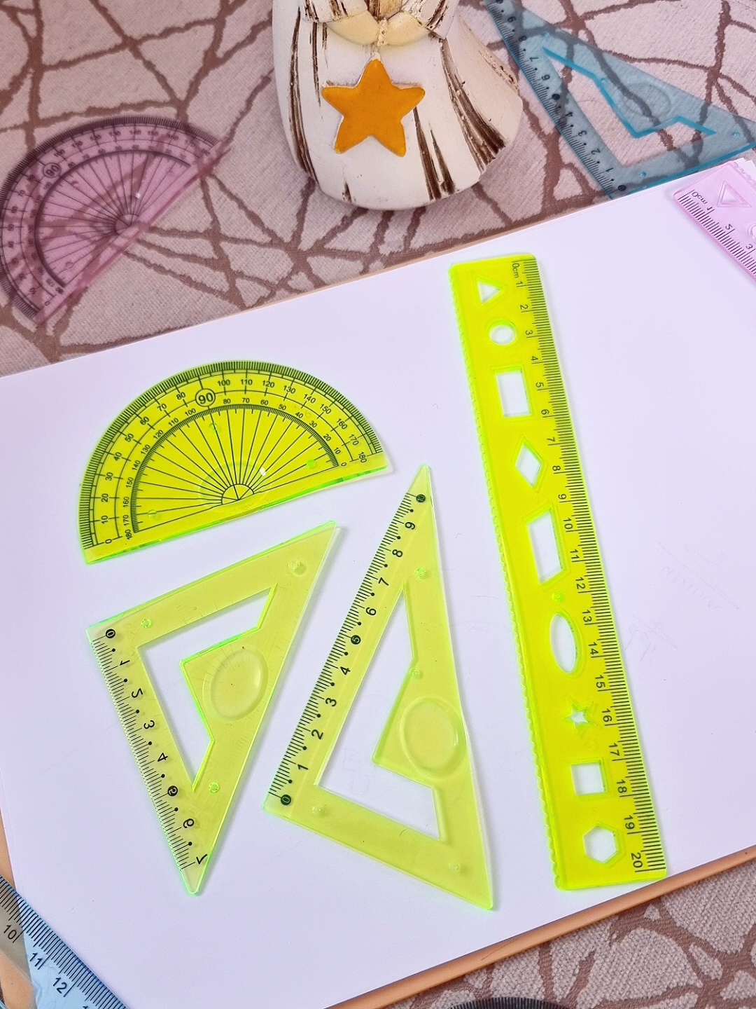ست شامل 1 خط کش 20 سانتی، یک نقاله، 1 گونیا 90درجه و یک گونیا 45 درجه میباشد